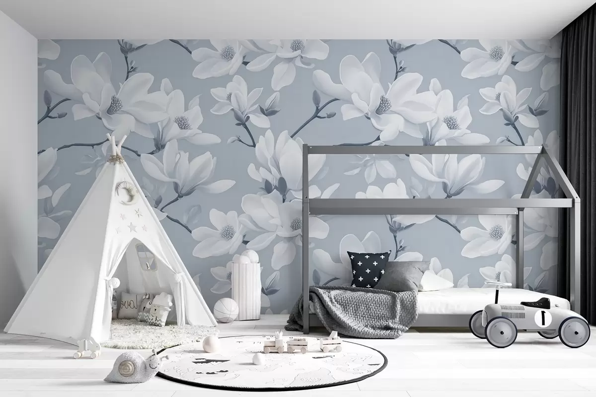 Fotomurales Estampado de flores blancas de magnolia, en tonos azul claro, hojas y ramas blancas Nr. w08726v2
