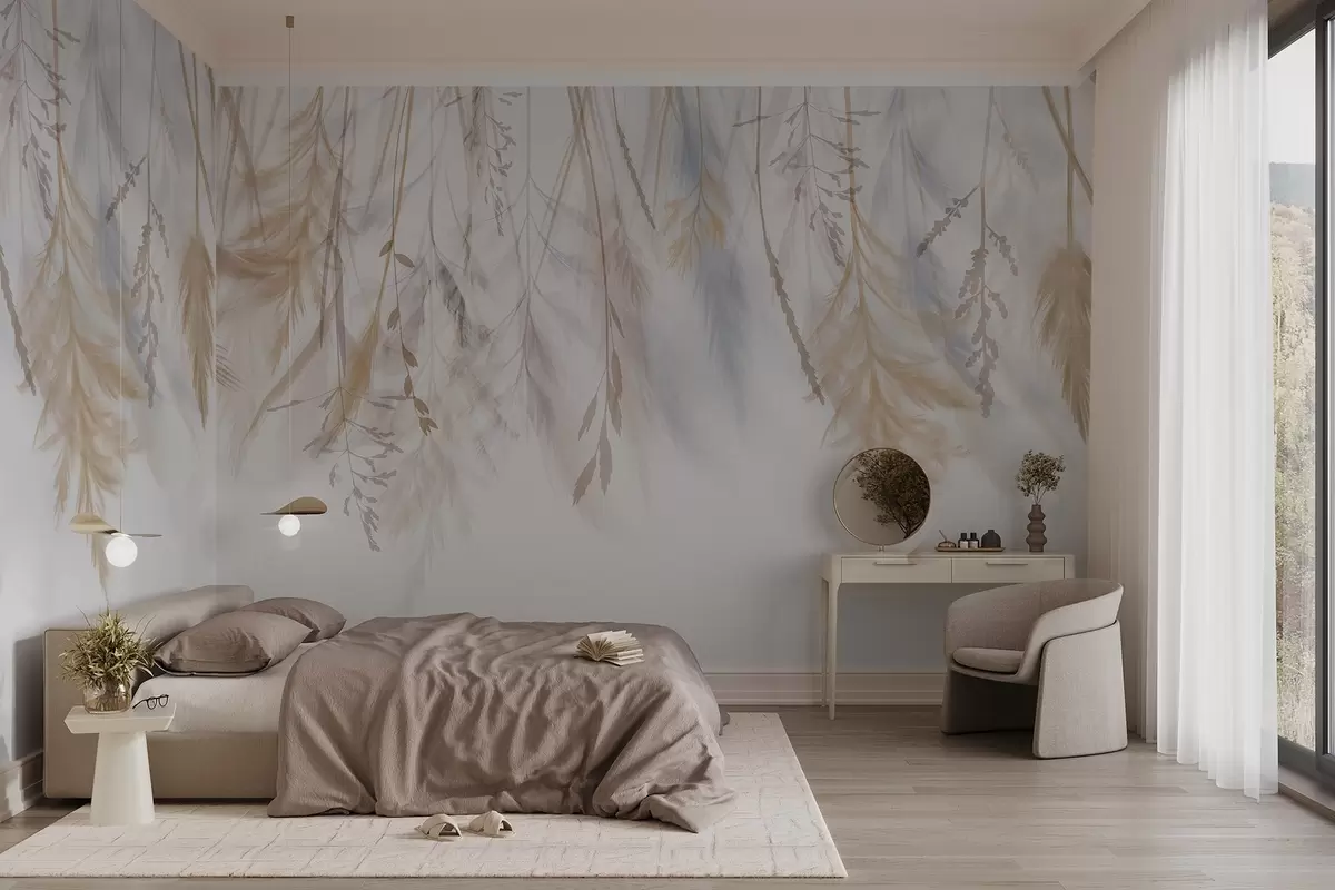 Fotomurales Delicadas hierbas, espiguillas y plantas en tonos pastel, dispuestas en un estampado en cascada sobre un fondo pálido Nr. w08737