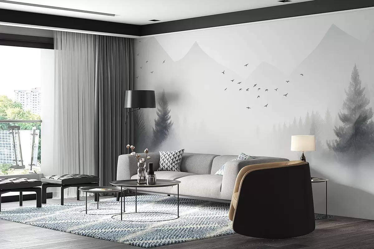 Fotomurales Sereno bosque invernal en la ladera de una montaña en tonos blancos y grises claros Nr. w08756