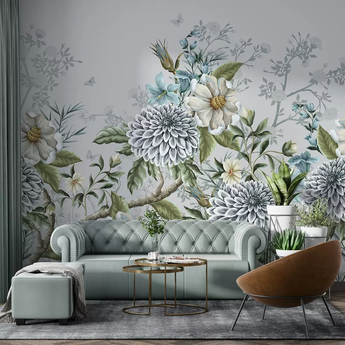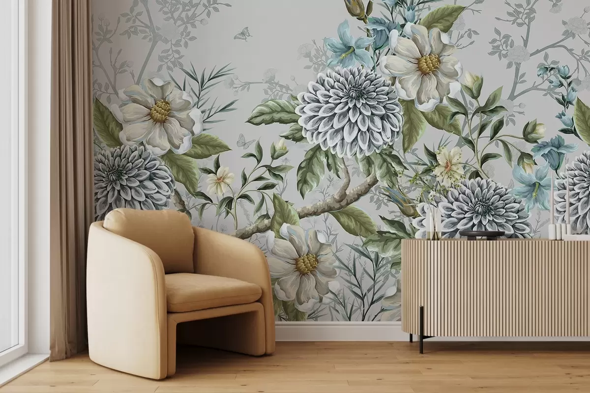 Fotomurales Un estampado floral con crisantemos, delicadas flores azules y hojas verdes entrelazadas con ramas Nr. w08782