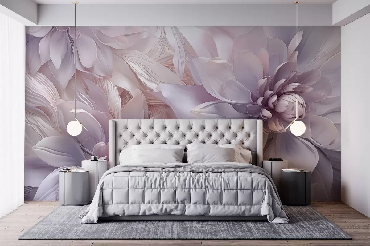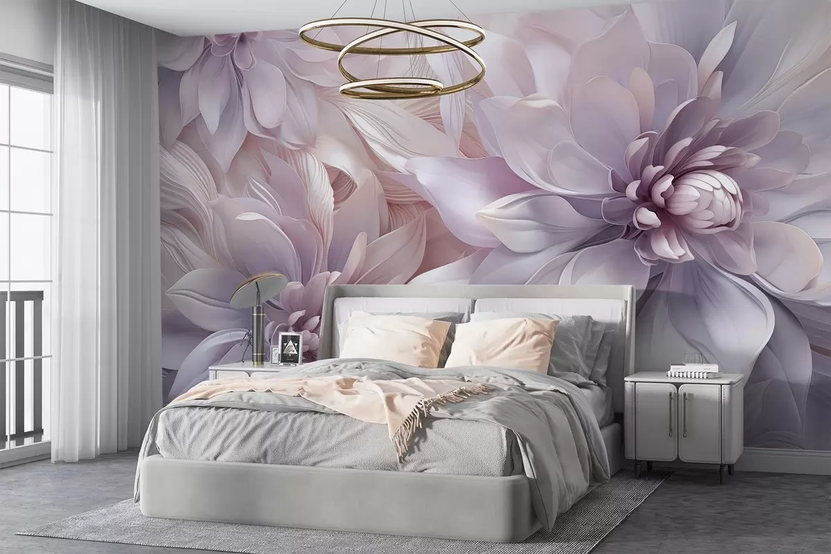 Fotomurales Flores suaves en capas en tonos rosa pálido, lavanda y blanco con delicados pétalos e intrincados detalles Nr. w08783