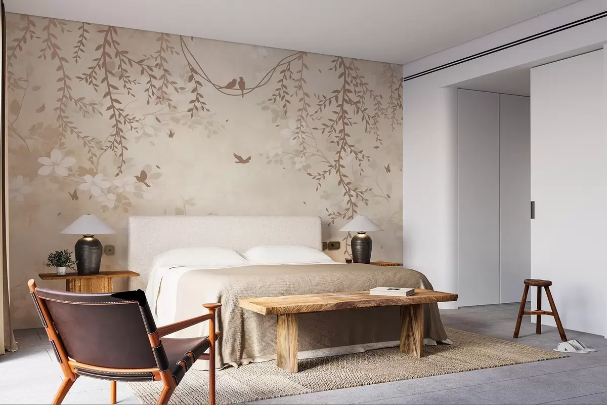 Fotomurales Pájaros con plantas colgantes y un motivo floral en tonos beige-crema claro Nr. w08809