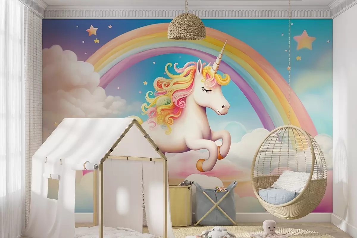 Fotomurales Un caballo unicornio con un arco iris, nubes y un cielo estrellado Nr. w08820