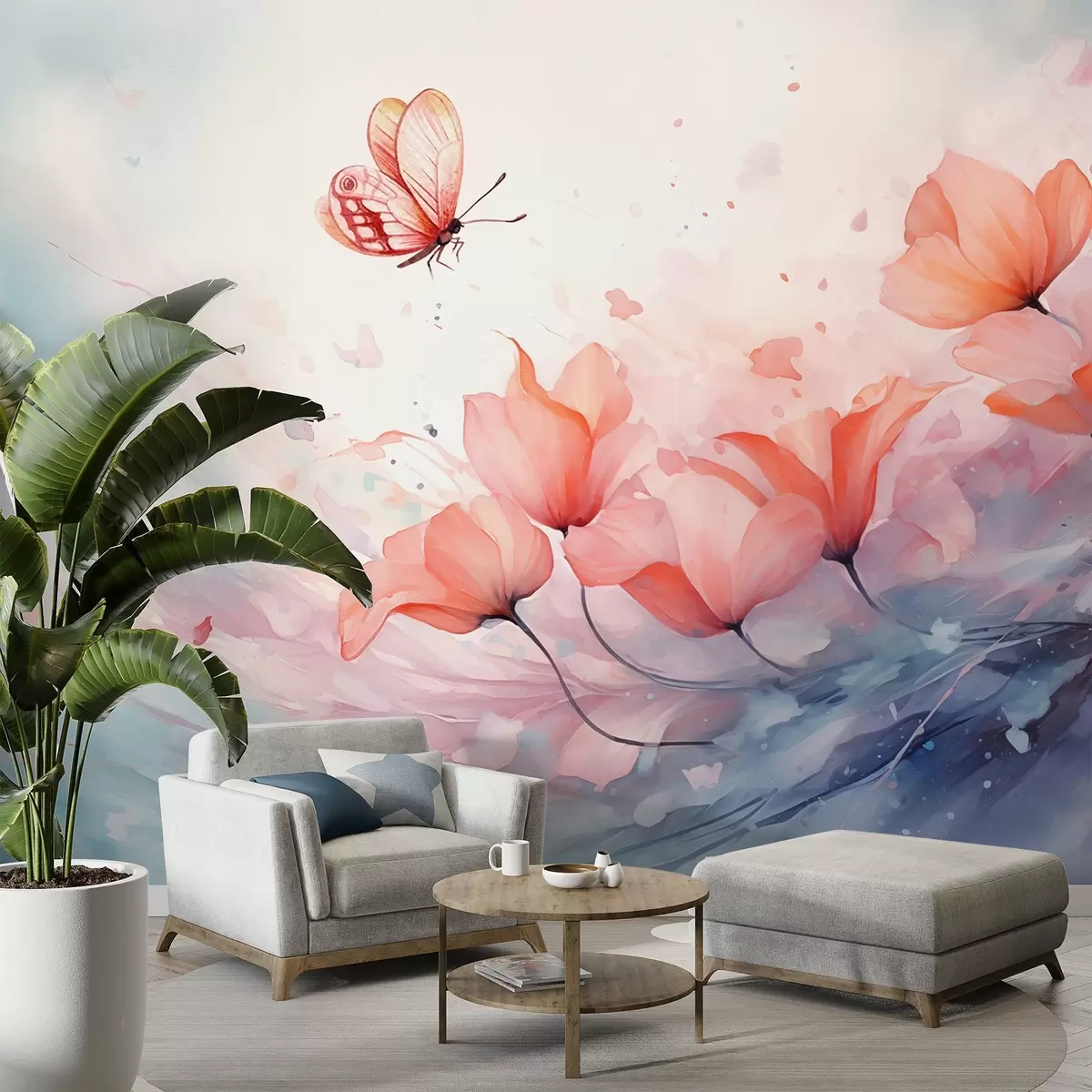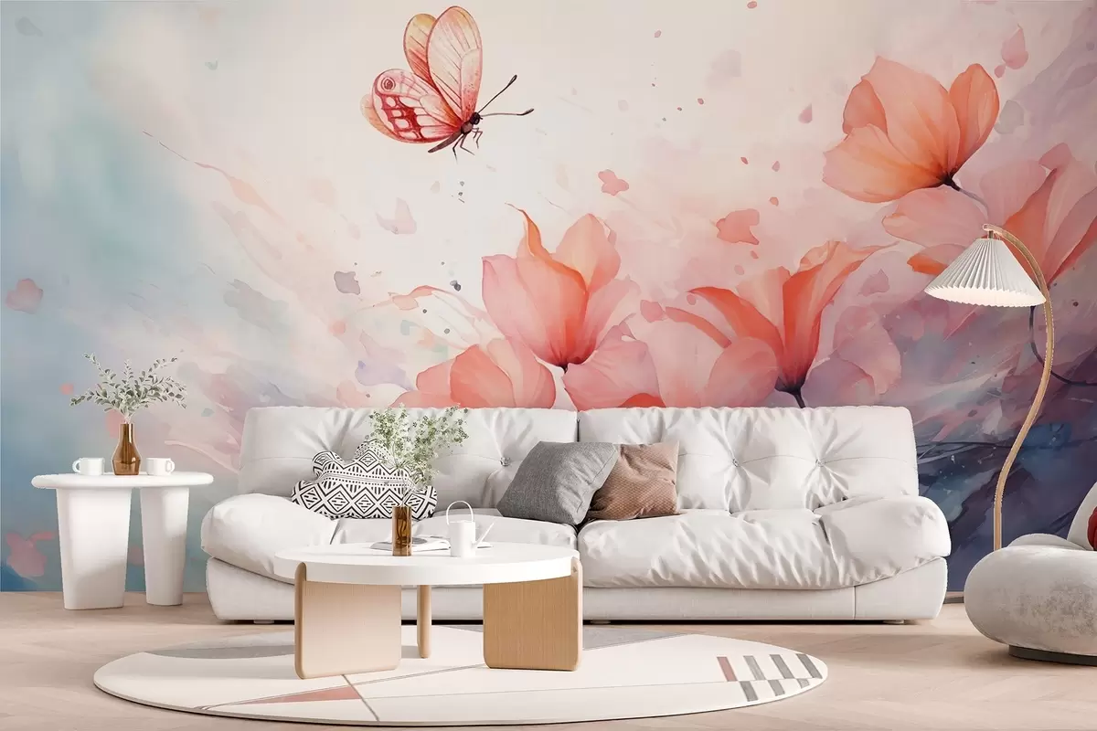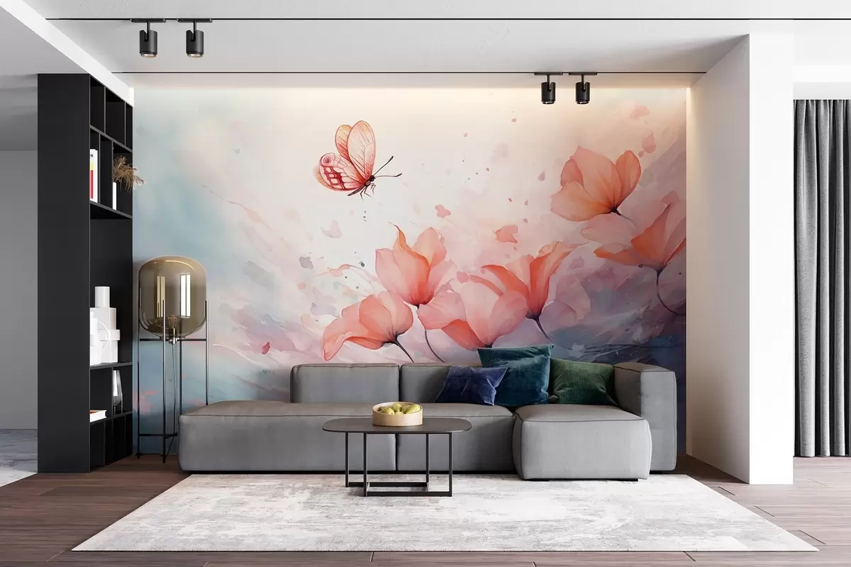 Fotomurales Delicadas amapolas con una mariposa en estilo acuarela Nr. w08849