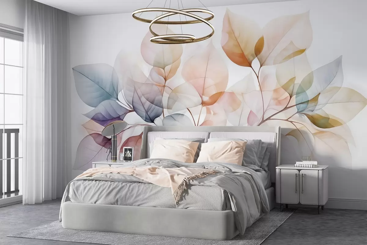 Fotomurales Pintura en acuarela de hojas translúcidas en colores pastel, con tonos rosas, blancos, morados y azules Nr. w08910