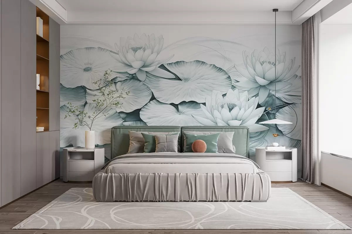 Fotomurales Nenúfares y nenúfares en un estanque, turquesa y blanco imitación de dibujo a lápiz, ilustración botánica detallada, arte de la naturaleza Nr. w09006v1