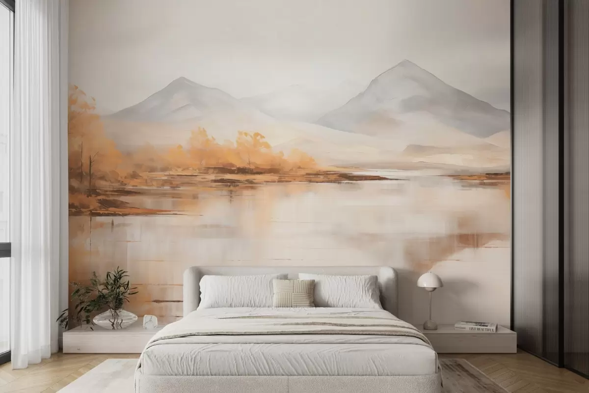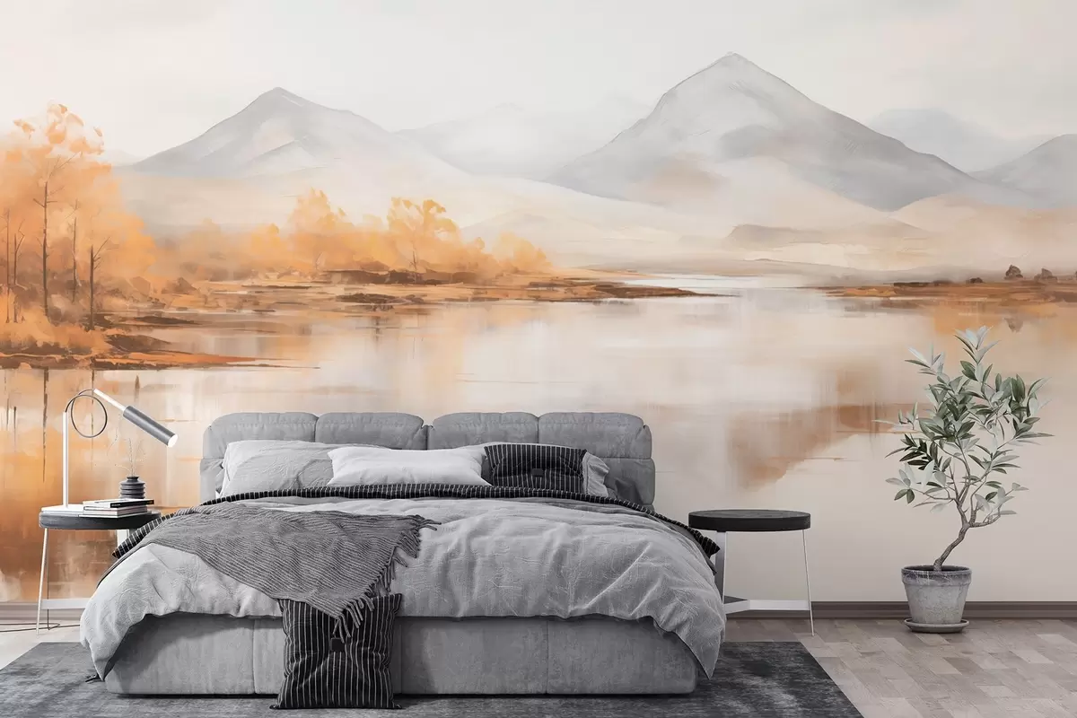Fotomurales Paisaje otoñal con árboles amarillos y un río sobre un fondo montañoso Nr. w09020