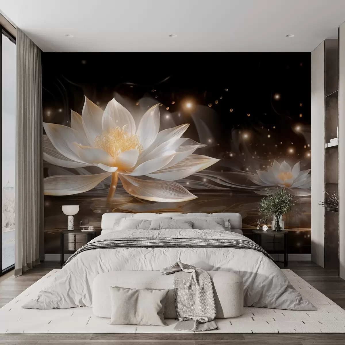 Fotomurales Elegantes nenúfares blancos sobre agua oscura Nr. w09021