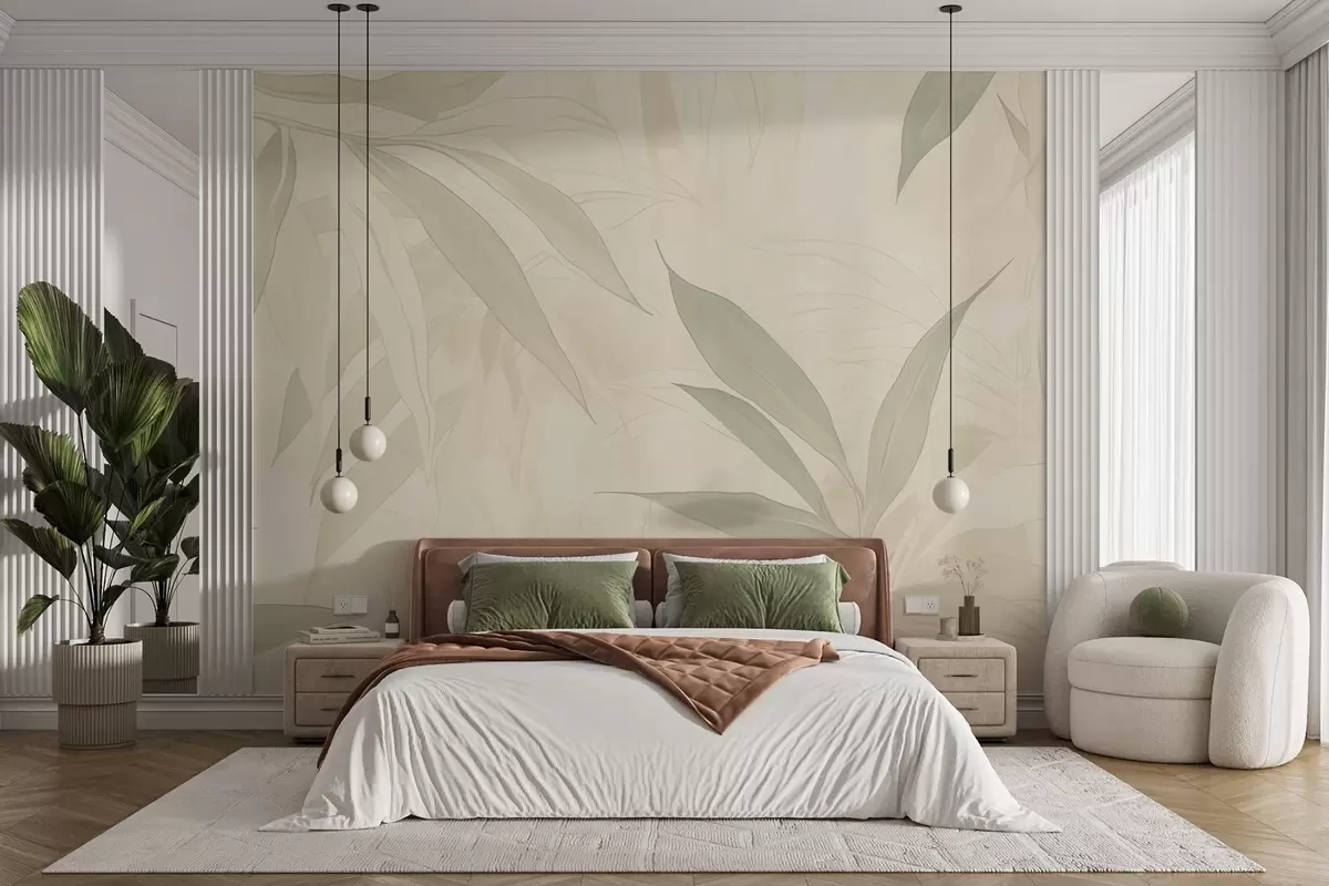 Fotomurales Ramas con hojas en suaves tonos verdes sobre fondo beige Nr. w09027