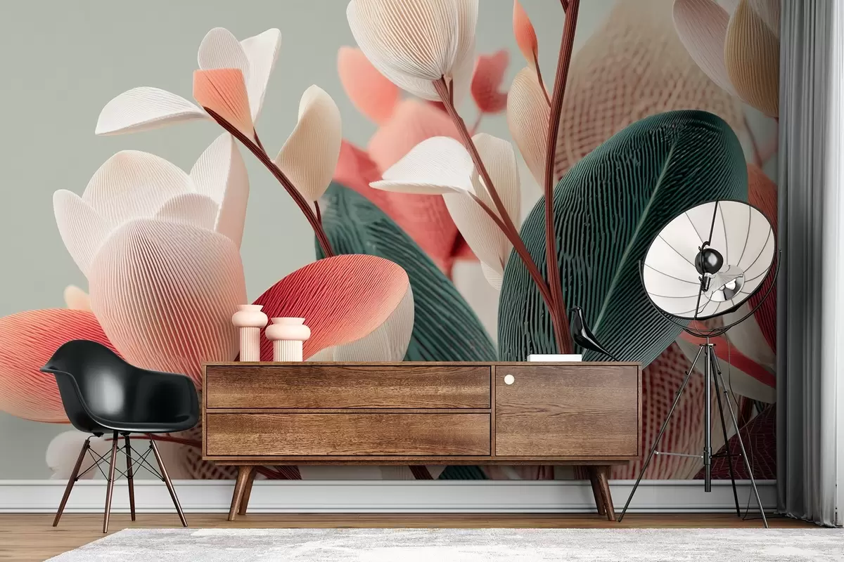 Fotomurales Flores y hojas texturizadas en tonos pastel y verdes Nr. w09094