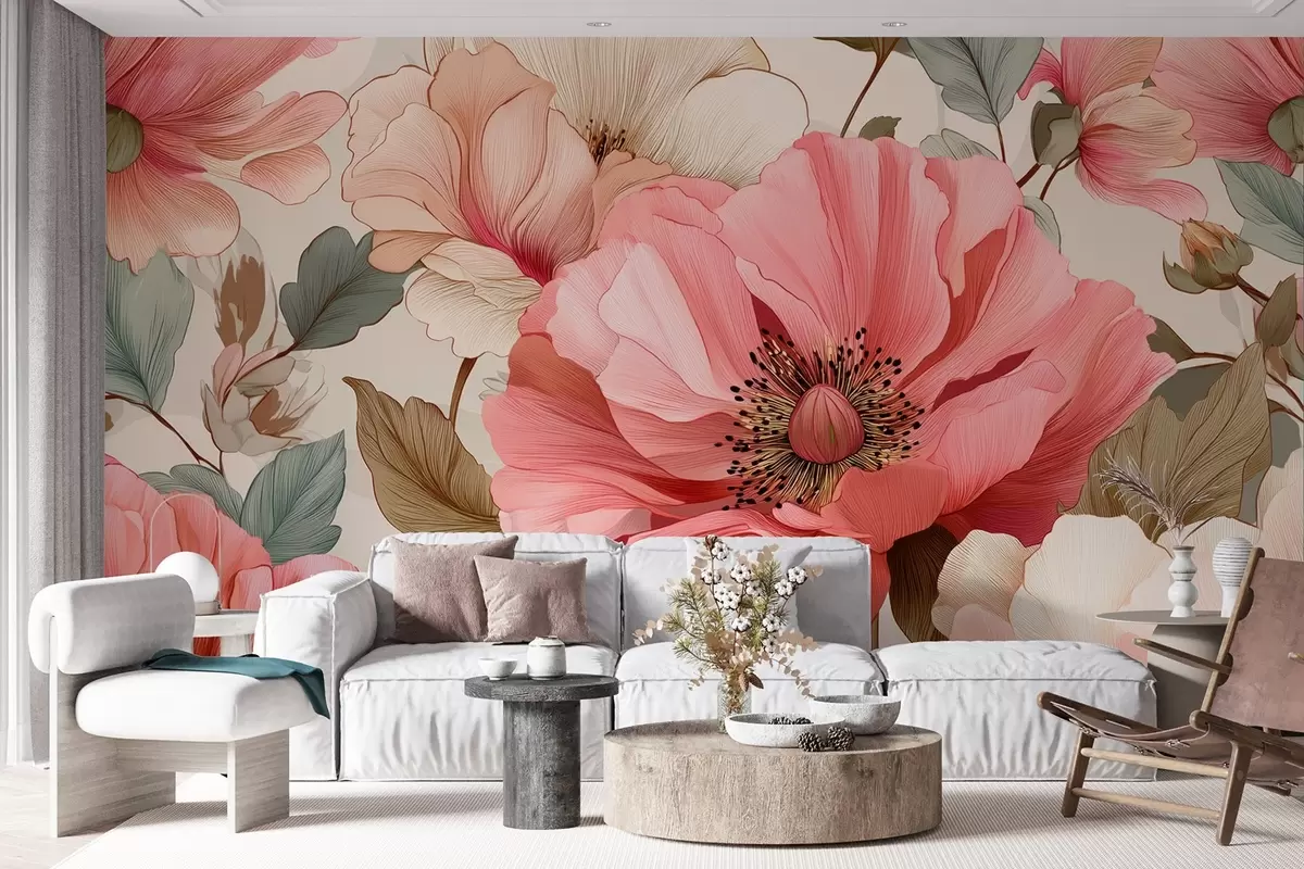Fotomurales Delicadas amapolas con hojas en tonos rojo-rosa Nr. w09100