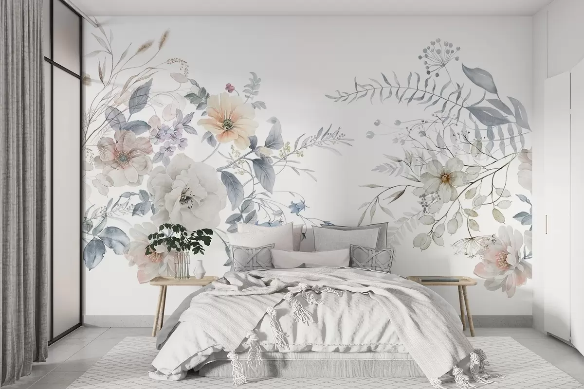 Fotomurales Arreglo floral en estilo de pintura de acuarela con flores blancas, melocotón y azul, delicada vegetación sobre fondo blanco Nr. w09108