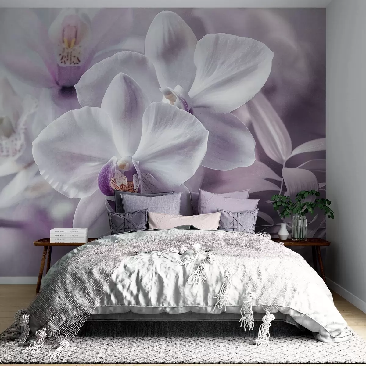 Fotomurales Delicadas flores de orquídea blancas y lilas, iluminación suave y fondo difuminado con textura Nr. w09155