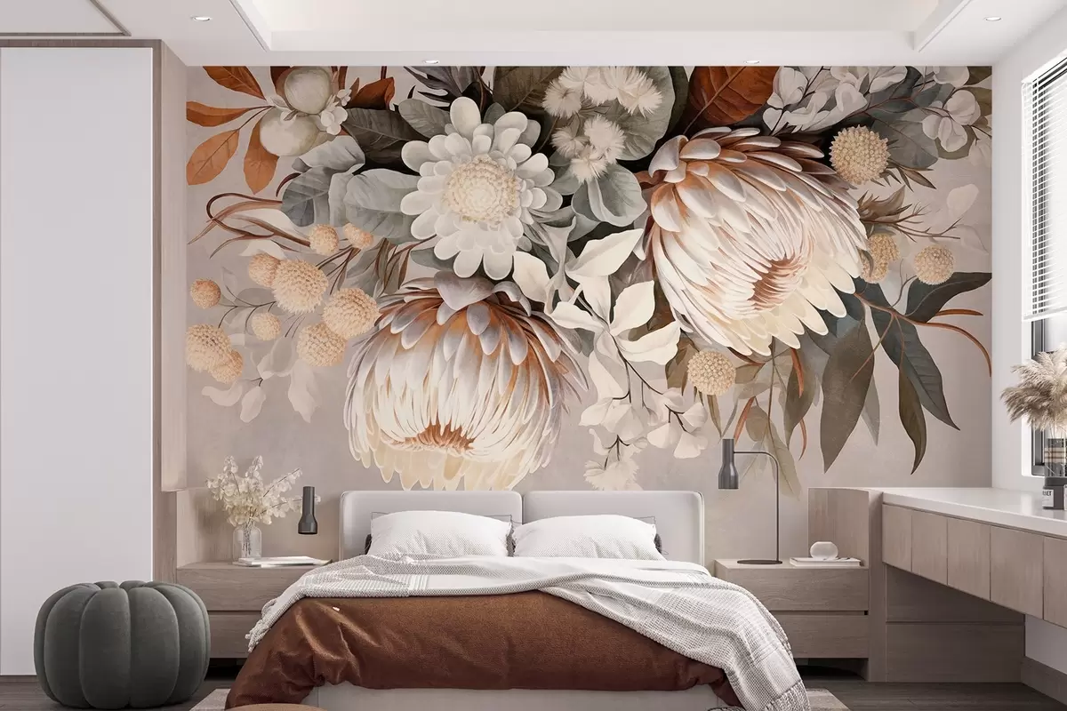 Fotomurales Gran protea texturizada con toques marrones, margaritas blancas y flores amarillas, fondo beige apagado Nr. w09157