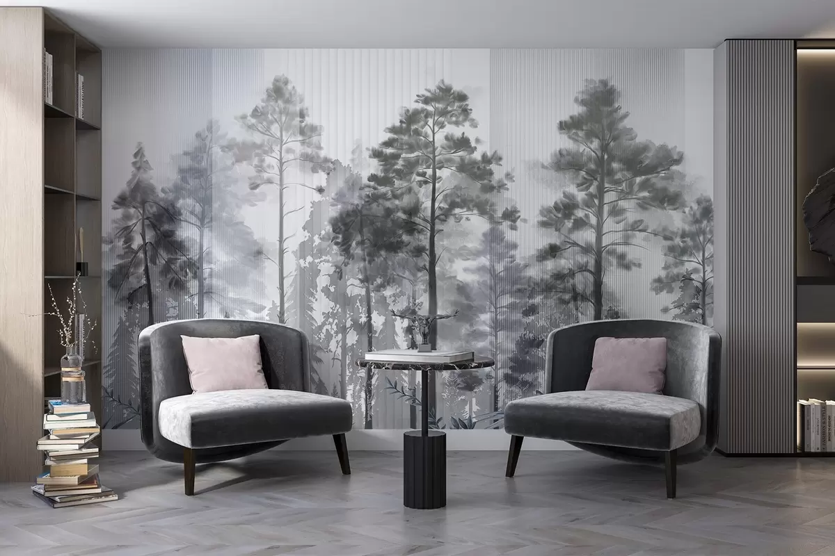 Fotomurales Un denso bosque con altos pinos, exuberante follaje gris, una atmósfera brumosa con texturas de líneas verticales Nr. w09163v2