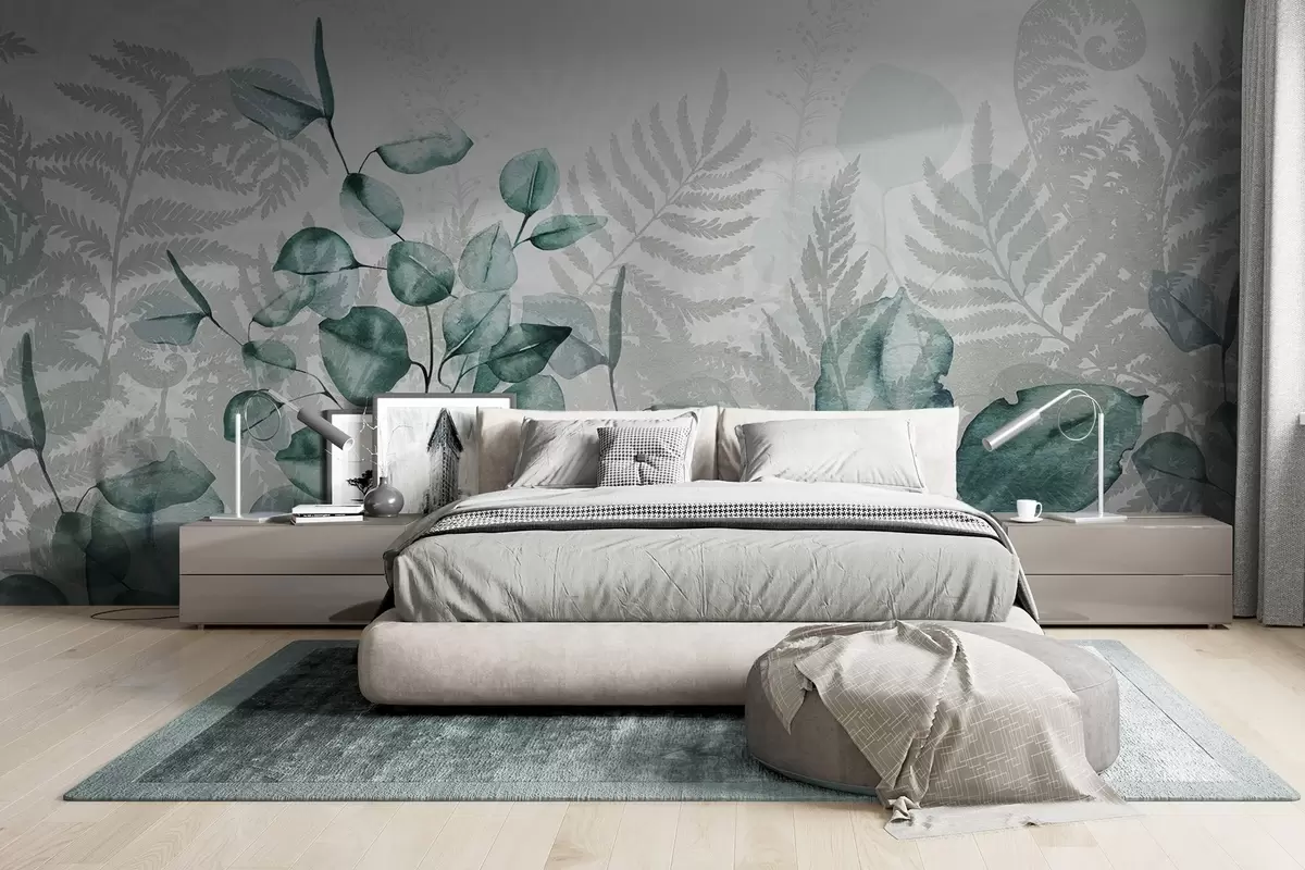Fotomurales Hojas de eucalipto y helecho en tonos verdes y grises, efecto acuarela , ilustración botánica Nr. w09197