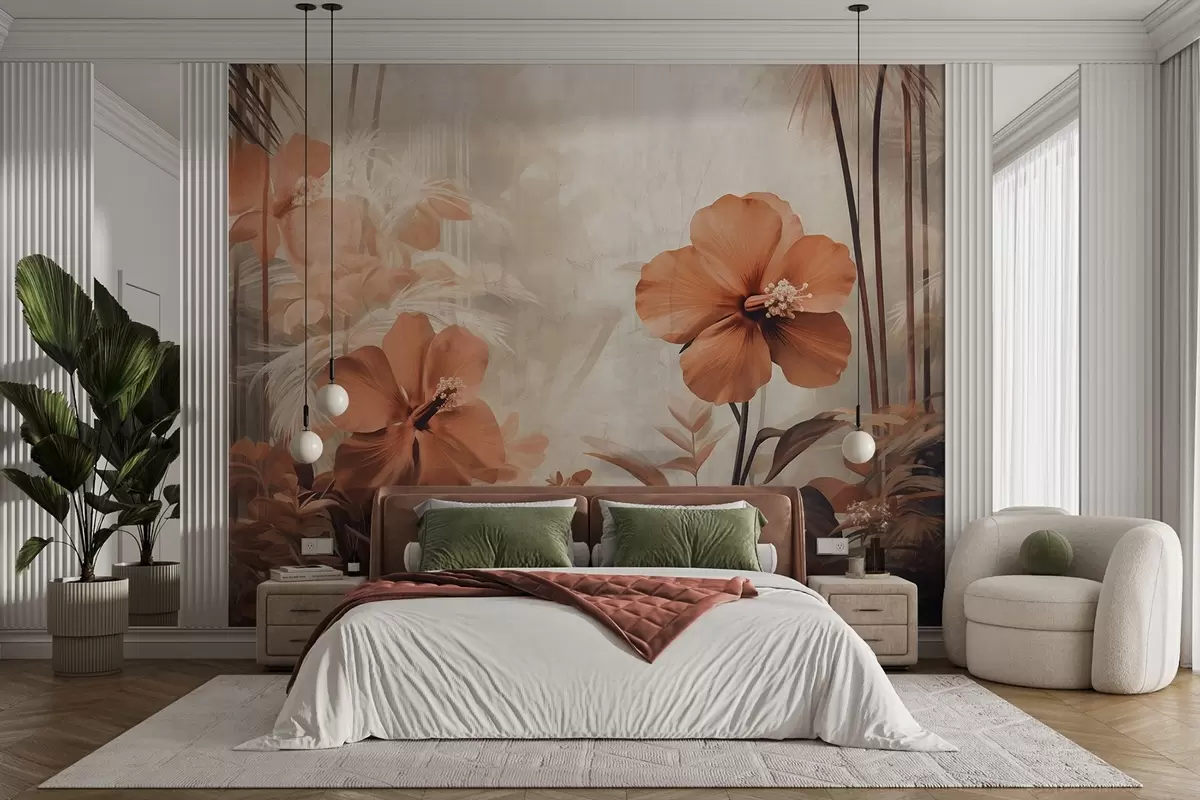 Fotomurales Flores de hibisco rojo pastel con hojas y tallos, vegetación tropical, colores suaves y apagados, estilo vintage Nr. w09203