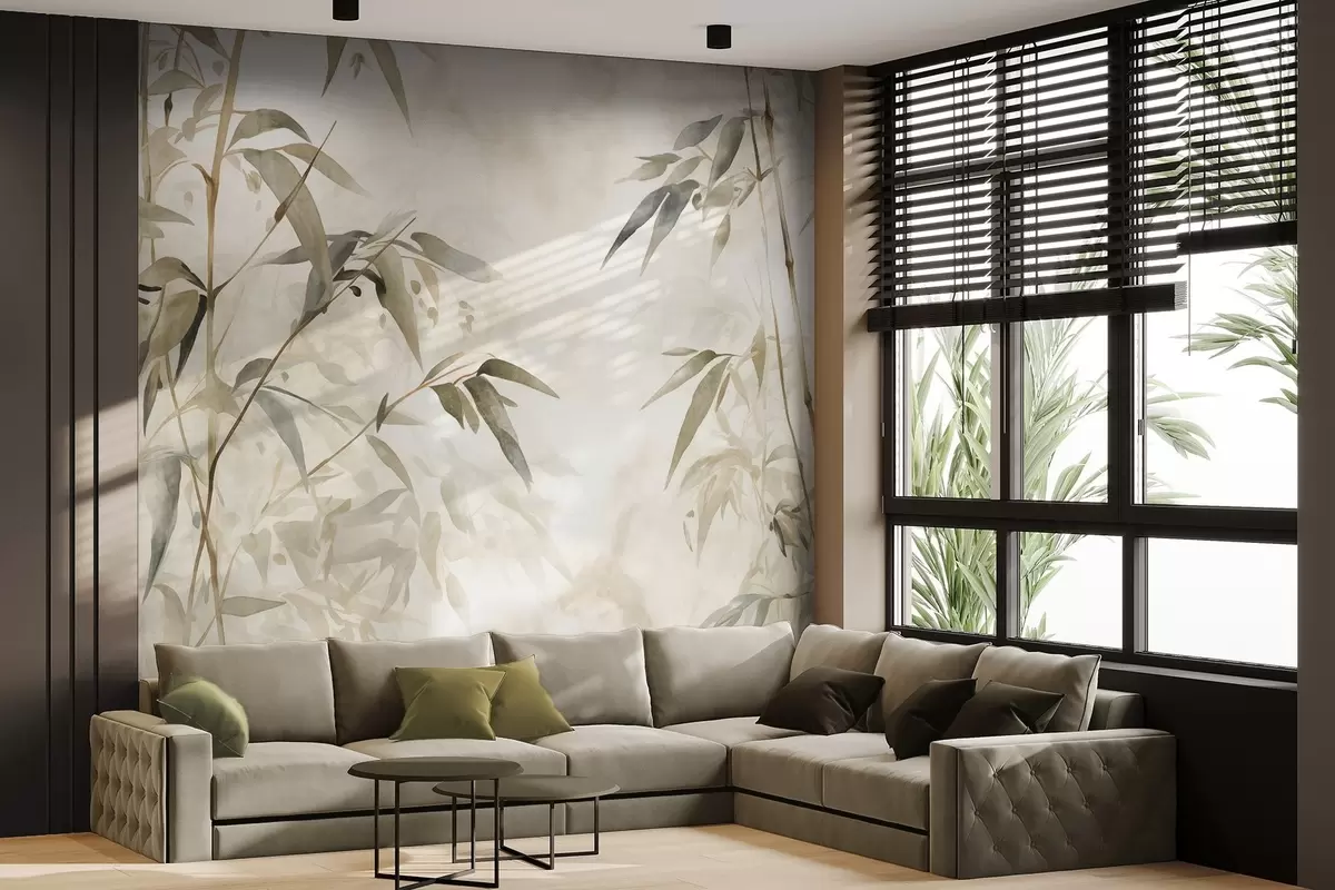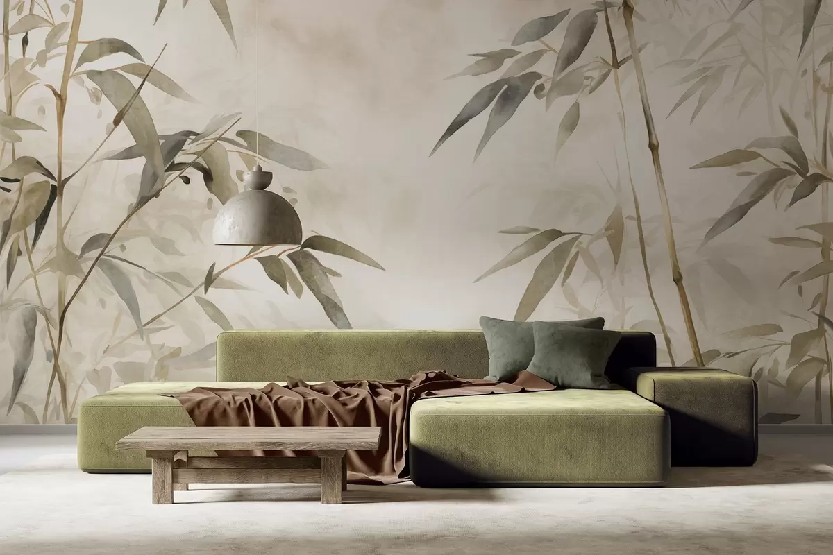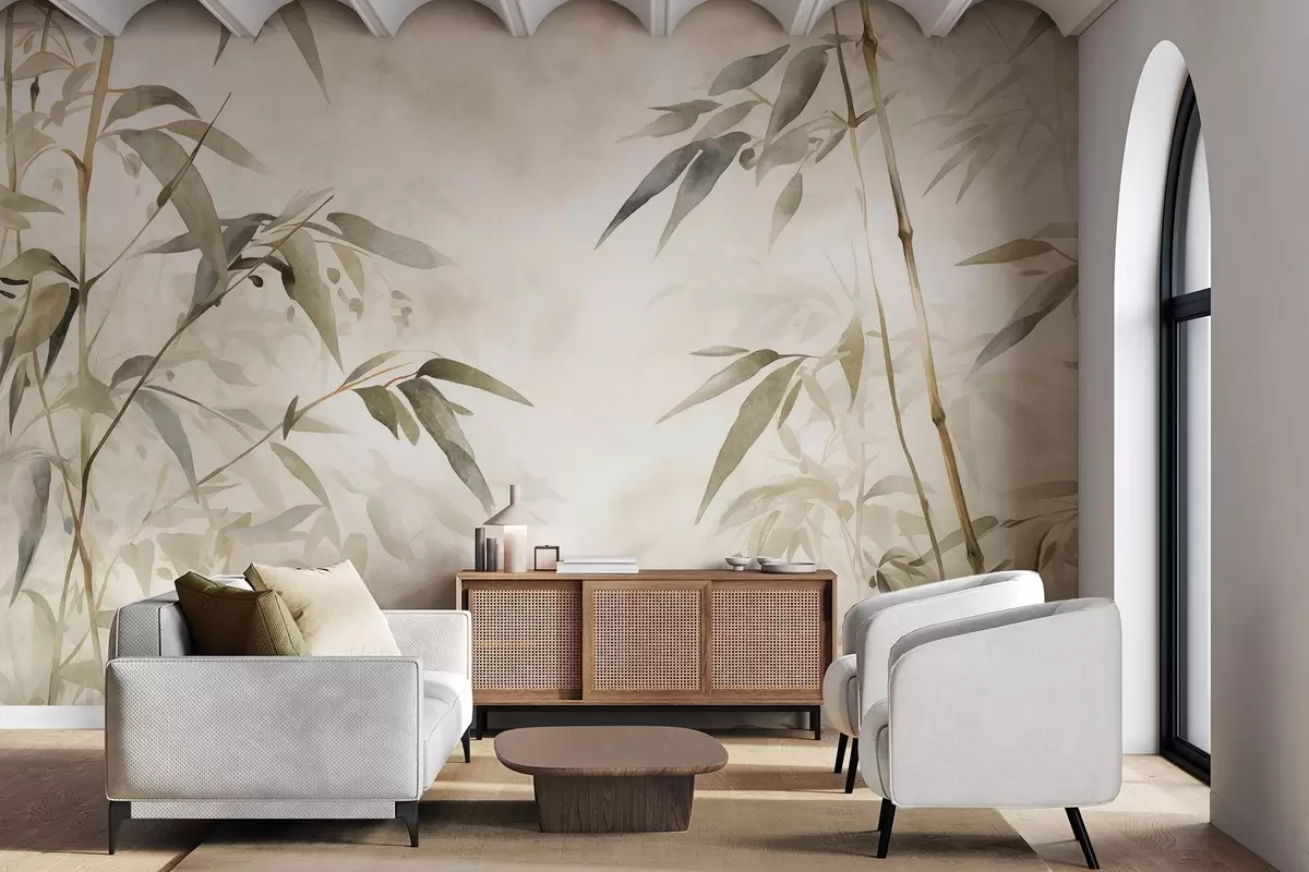 Fotomurales Ramas con textura de bambú y hojas en estilo acuarela, suave paleta de colores neutros, fondo beige claro Nr. w09204