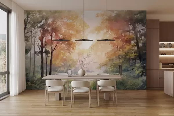 Fotomurales Paisaje forestal texturizado, árboles con hojas naranjas y verdes, paleta de colores pastel Nr. w09210v1