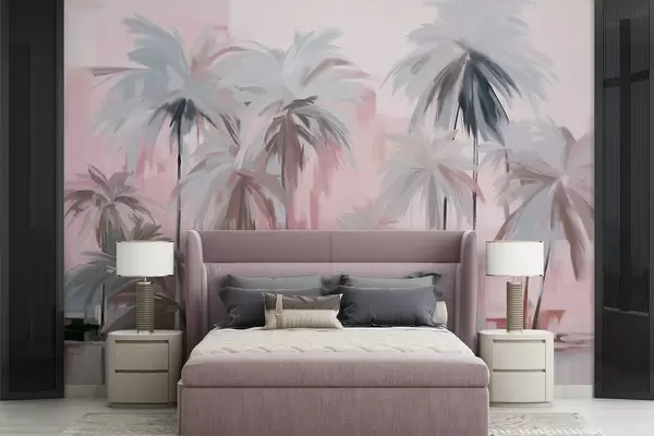 Fotomurales Palmeras tropicales abstractas minimalistas en tonos pastel, sobre un fondo de tonos rosas y grises apagados Nr. w09212v1