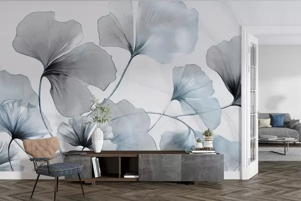 Fotomurales Hojas de Ginkgo biloba en tonos azules y grises apagados, delicado efecto de acuarela texturizada, fondo claro Nr. w09215v1