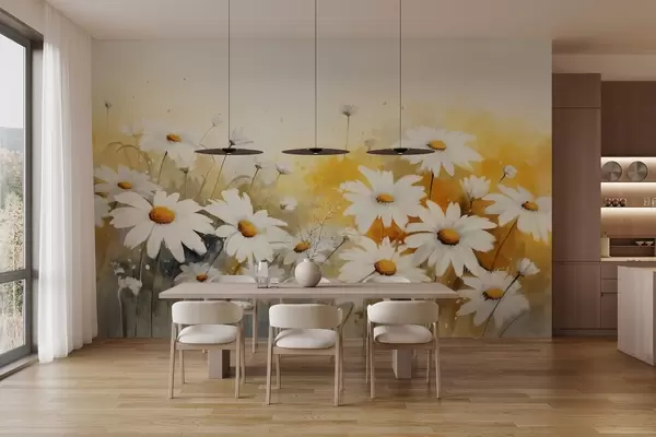 Fotomurales Un campo de margaritas blancas con centros amarillos, sobre un suave fondo amarillo y beige, estilo acuarela Nr. w09218