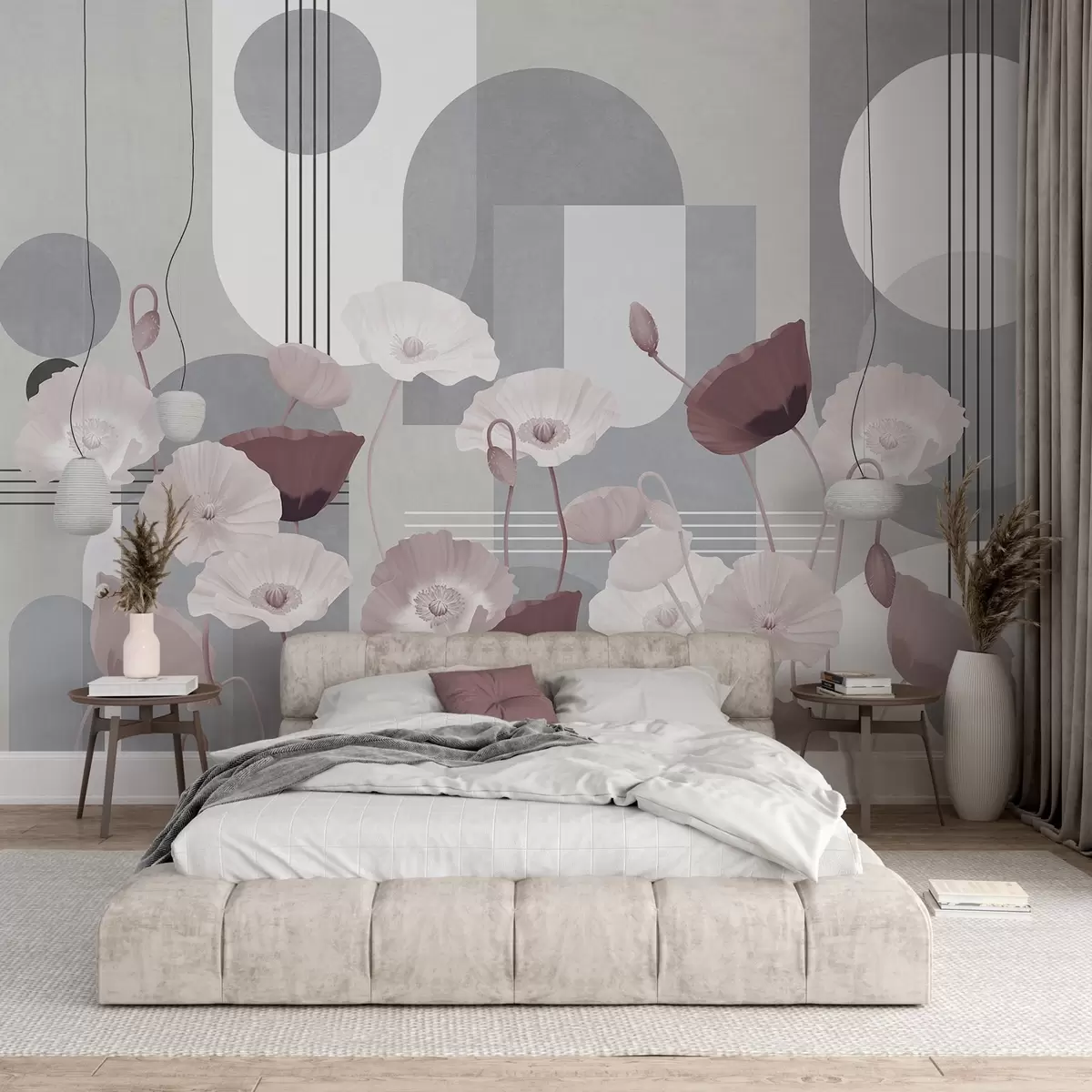 Fotomurales Amapolas en colores blanco y gris con formas geométricas en el fondo, círculos y arcos, estilo minimalista, colores suaves Nr. w09289v1