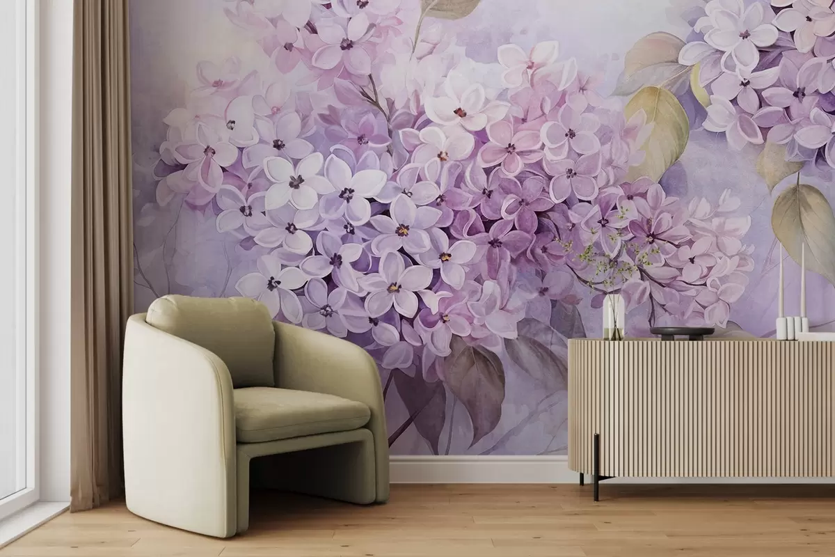 Fotomurales Flores de textura lila con pétalos púrpura claro, hojas verde claro, estilo acuarela, colores suaves y pastel, pinceladas delicadas Nr. w09291