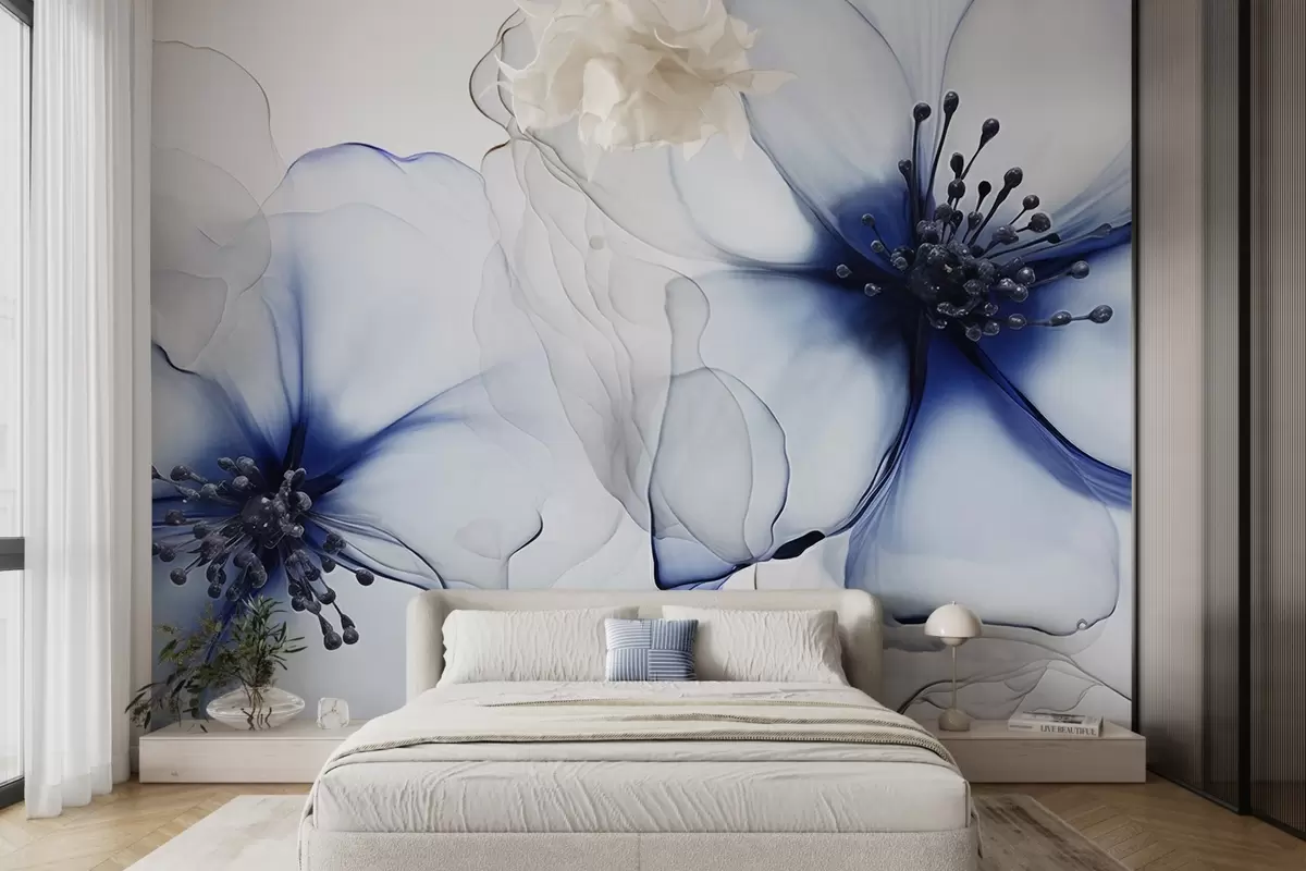 Fotomurales Dos flores azules de textura translúcida con estambres visibles, delicados pétalos superpuestos y una suave textura fluida Nr. w09295v1