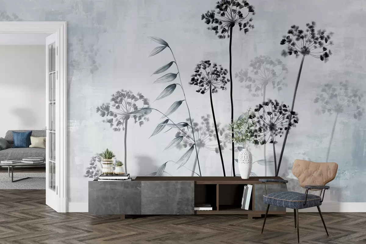 Fotomurales Dibujo de flores secas con tallos largos, paleta monocroma, sobre fondo gris claro texturado, ilustración botánica Nr. w09314