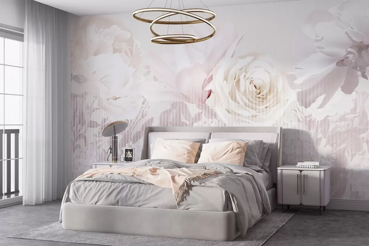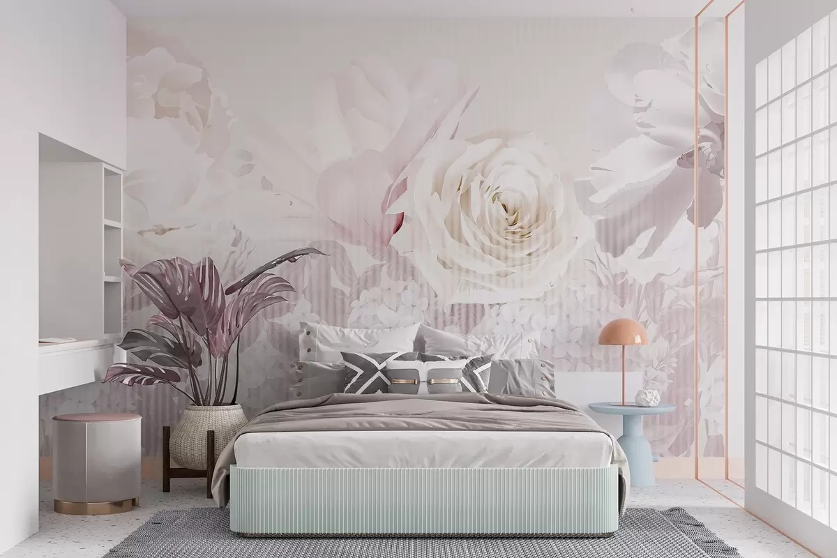 Fotomurales Arreglo floral con rosas, hortensias y tulipanes en suaves tonos pastel de blanco, rosa y beige, con textura rayada Nr. w09340
