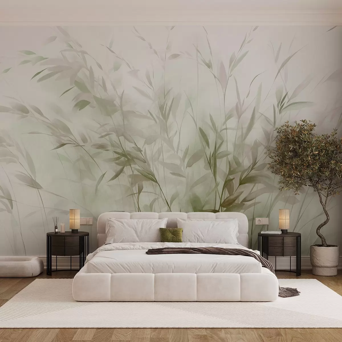 Fotomurales Hierba y maleza con hojas y tallos finos, colores verde claro y marrón, pinceladas suaves y delicadas, estampado minimalista Nr. w09342