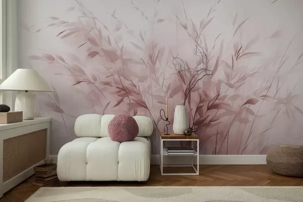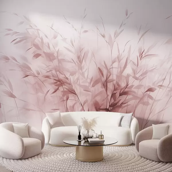 Fotomurales Hierba y maleza con hojas y tallos finos, colores rosa claro, pinceladas suaves y delicadas, estampado minimalista Nr. w09342v2