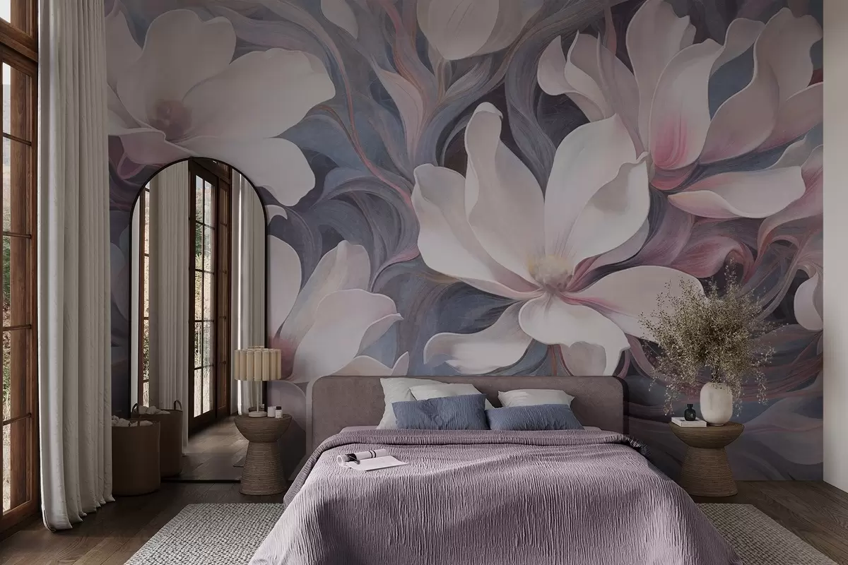 Fotomurales Pintura texturizada de flores blancas de magnolia con toques rosas, sobre un fondo de tonos azules y grises apagados Nr. w09344