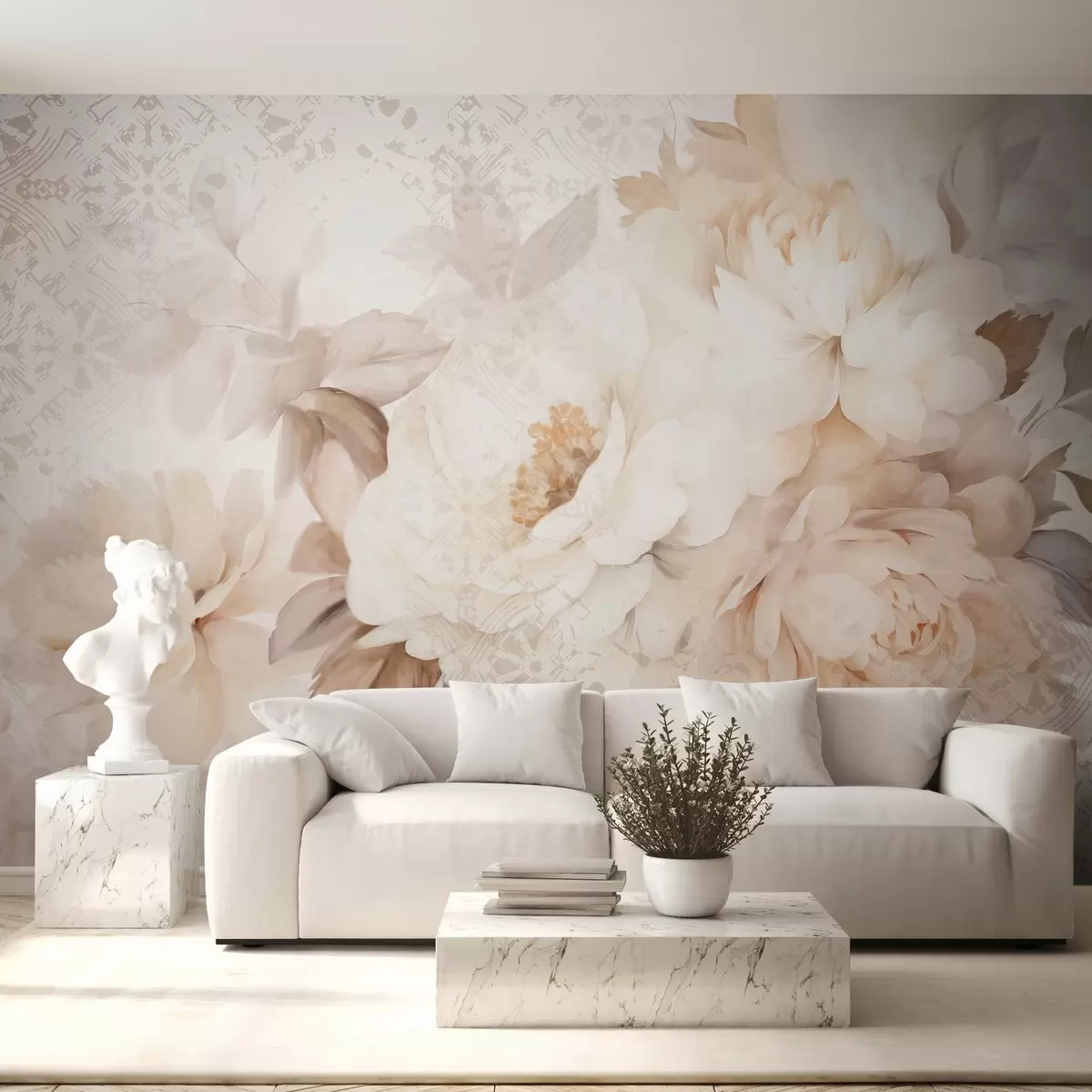 Fotomurales Un arreglo floral de peonías blancas con hojas beige, sobre un fondo decorativo con textura vintage Nr. w09345