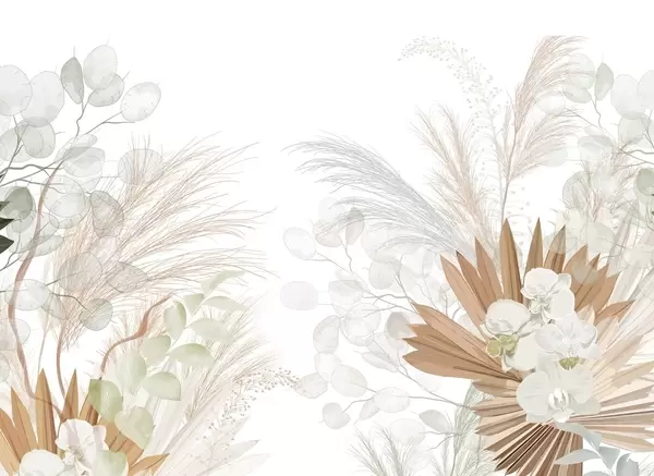 Fotomurales Hierba de la pampa, eucalipto, hojas tropicales y orquídeas sobre fondo blanco, colores pastel. Nr. w09366