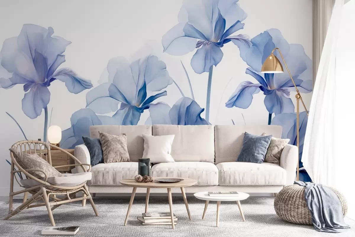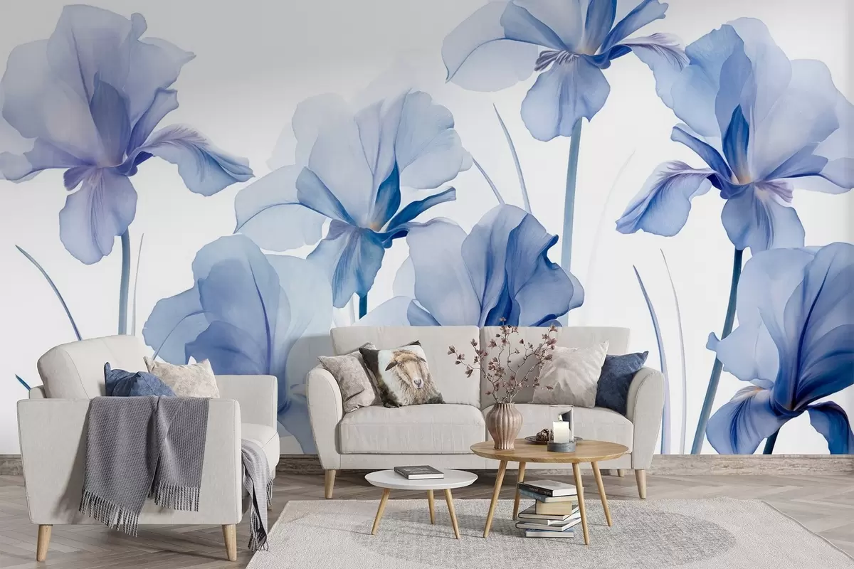Fotomurales Flores de iris azules con pétalos translúcidos y tallos largos, dispuestas en fila sobre un fondo azul, suave y texturizado Nr. w09379