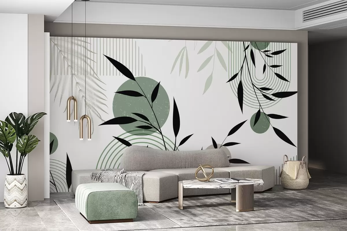 Fotomurales Estampado abstracto texturizado con formas geométricas, círculos y arcos y plantas negras y verdes sobre fondo blanco Nr. w09384