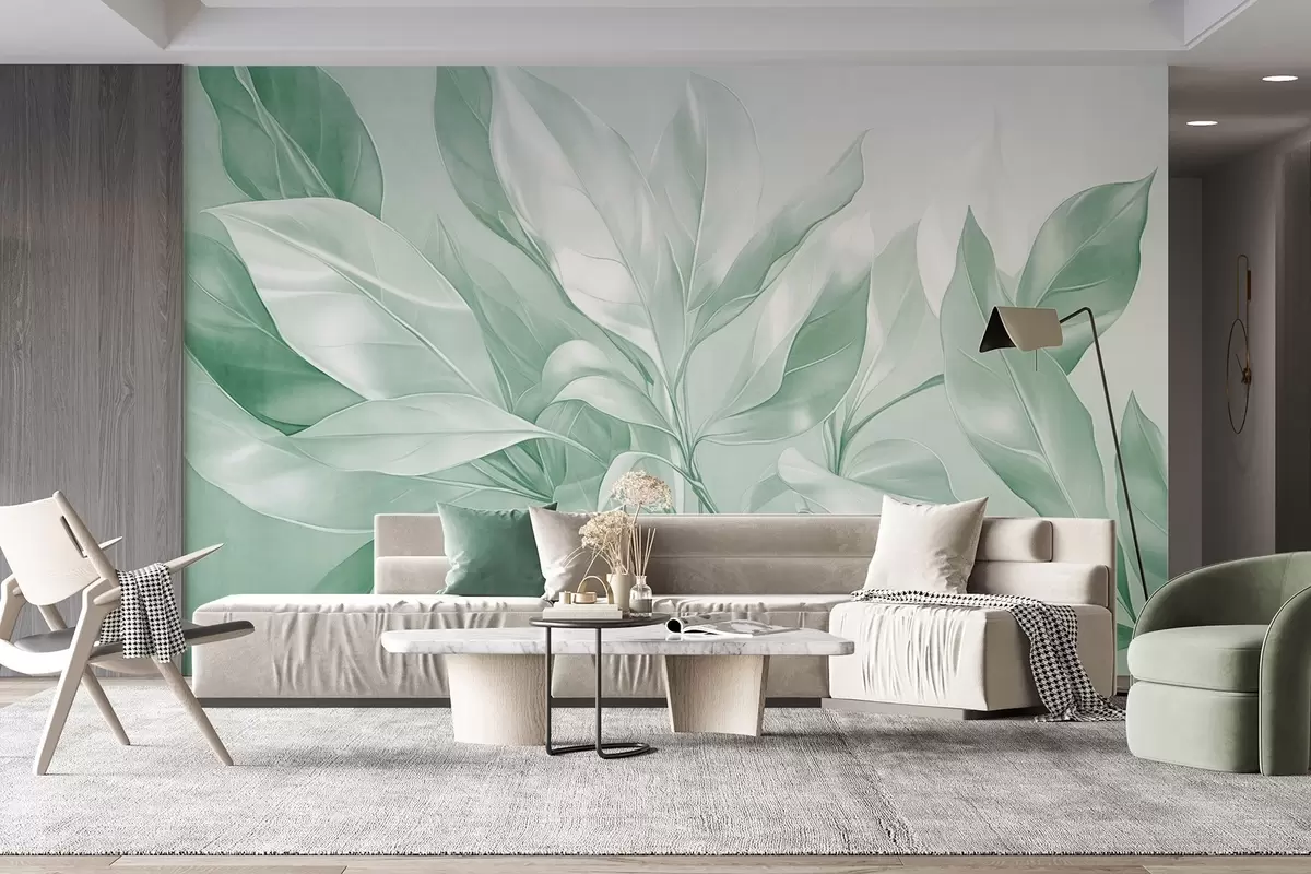Fotomurales Hojas de magnolia con tonos blancos y verdes, iluminación suave, composición elegante, venas de las hojas detalladas, pinceladas artísticas Nr. w09385v1