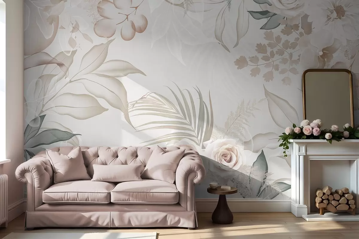 Fotomurales Arreglo floral con textura, compuesto por rosas, orquídeas, eucalipto y hojas de palmera en colores pastel, con fondo beige Nr. w09393
