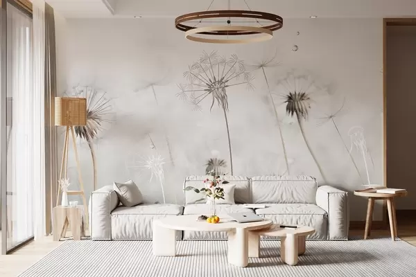 Fotomurales Dientes de león con gotas de agua, fondo blanco, primer plano, luz suave, naturaleza, botánico, etéreo, delicado, minimalista Nr. w09399