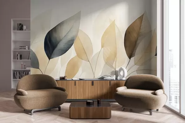 Fotomurales Pintura texturizada imitación de hojas en tonos marrones, amarillos y grises, con delicadas venas y tallos Nr. w09400
