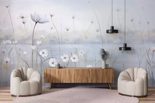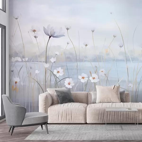 Fotomurales Flores blancas con tallos largos en un campo, cielo azul claro, colores suaves, textura, estilo minimalista, inspirado en la naturaleza, fondo tranquilo Nr. w09401