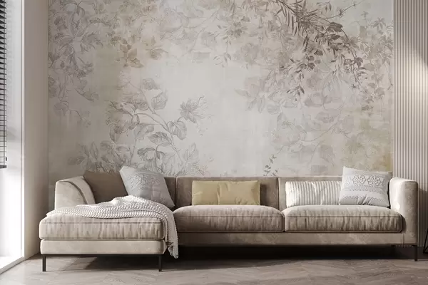 Fotomurales Arte floral vintage con textura, ilustraciones de delicadas flores y hojas de jardín en estilo dibujo, suaves tonos pastel beige y sepia Nr. w09402