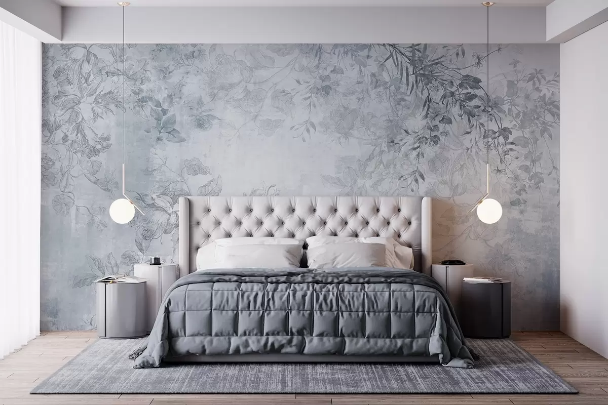 Fotomurales Arte floral vintage con textura, ilustraciones de delicadas flores y hojas de jardín en estilo dibujo, tonos azules suaves Nr. w09402v1