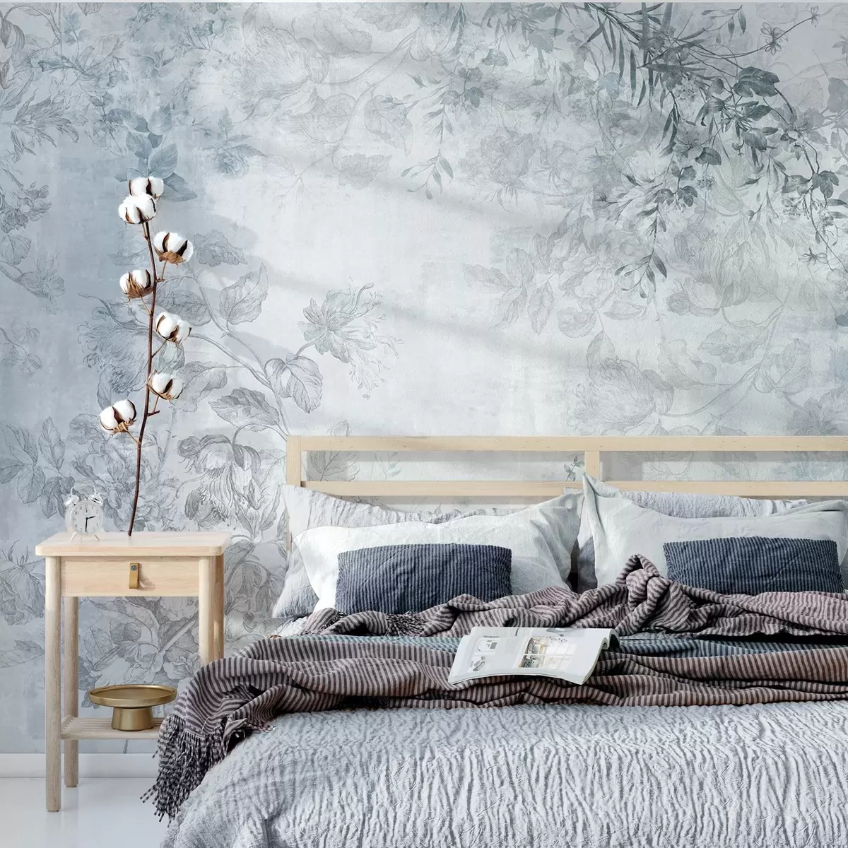 Fotomurales Arte floral vintage con textura, ilustraciones de delicadas flores y hojas de jardín en estilo dibujo, tonos azules suaves Nr. w09402v1
