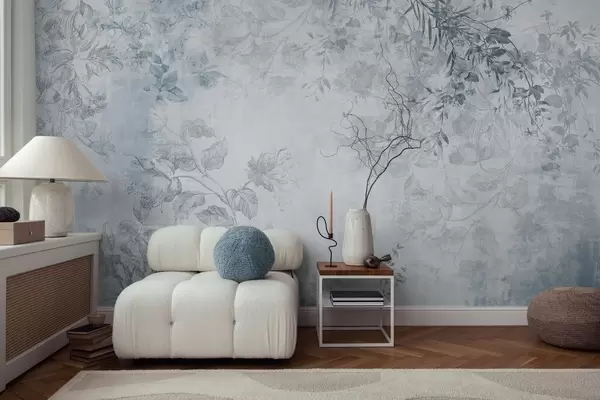Fotomurales Arte floral vintage con textura, ilustraciones de delicadas flores y hojas de jardín en estilo dibujo, tonos azules suaves Nr. w09402v1