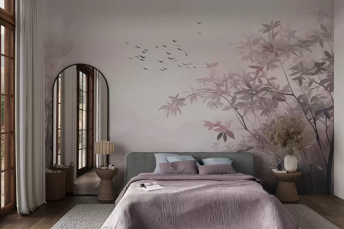 Fotomurales Paisaje texturizado con árboles y una bandada de pájaros volando en el cielo, colores pastel, escena natural Nr. w09418v1