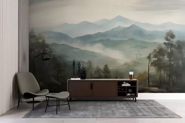 Fotomurales Cordillera brumosa con árboles, niebla, cielo nublado, colores apagados, estilo de pintura paisajística Nr. w09424