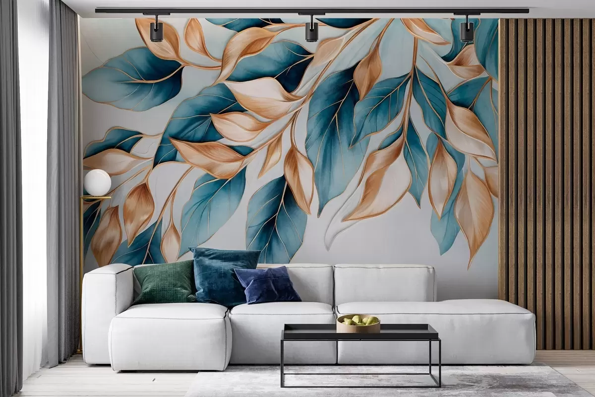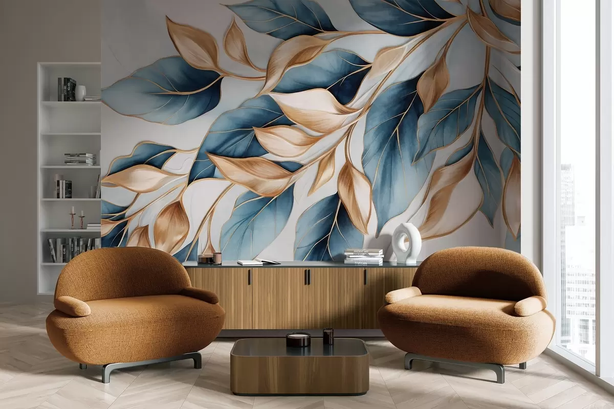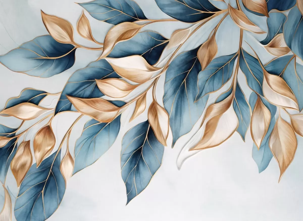 Fotomurales Hojas azules y naranjas con textura, fondo azul claro, diseño elegante y artístico, estilo moderno. Nr. w09429